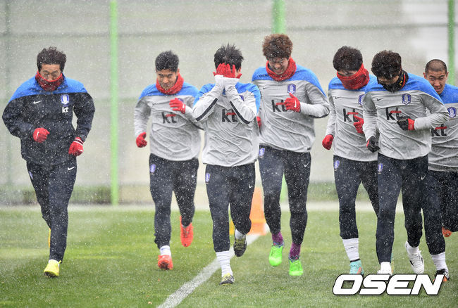 대표팀은 전날에 이어 전훈 둘째 날인 16일도 서귀포 시민축구장서 강행군을 이어갔다. 전날 굵은 빗줄기가 내린 뒤 쌀쌀한 날씨 속에서 첫 훈련에 임했던 슈틸리케호는 이날은 눈발이 휘날리고 강풍이 부는 그라운드를 누볐다. 아랑곳하지 않았다. 바늘귀 경쟁을 통과하려는 선수들의 '열정'과 '배고픔'은 여전했다.