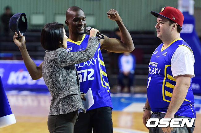 16일 오후 서울 잠실실내체육관에서 열린 '2014-2015 KCC 프로농구' 서울 삼성과 인천 전자랜드의 경기 시작전 샘 오취리와 샘 해밍턴이 시투자로 나서고 있다.