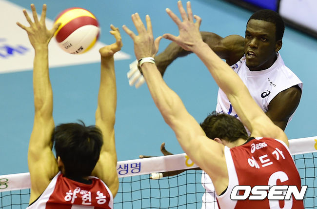 16일 오후 아산 이순신체육관에서 열린 '2014-2015 NH농협 V-리그' 우리카드와 LIG손해보험의 경기, 1세트 우리카드 까메호가 스파이크를 시도하고 있다.