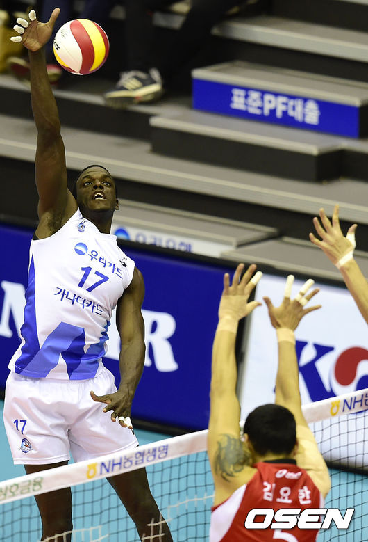 16일 오후 아산 이순신체육관에서 열린 '2014-2015 NH농협 V-리그' 우리카드와 LIG손해보험의 경기, 1세트 우리카드 까메호가 스파이크를 시도하고 있다.