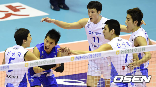 16일 오후 아산 이순신체육관에서 열린 '2014-2015 NH농협 V-리그' 우리카드와 LIG손해보험의 경기, 1세트 우리카드 선수들이 득점에 성공 기뻐하고 있다.