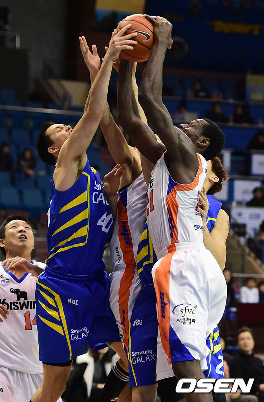 16일 오후 서울 잠실실내체육관에서 열린 '2014-2015 KCC 프로농구' 서울 삼성과 인천 전자랜드의 경기 3쿼터 이동준과 레더를 비롯한 양팀 선수들이 리바운드 다툼을 하고 있다.