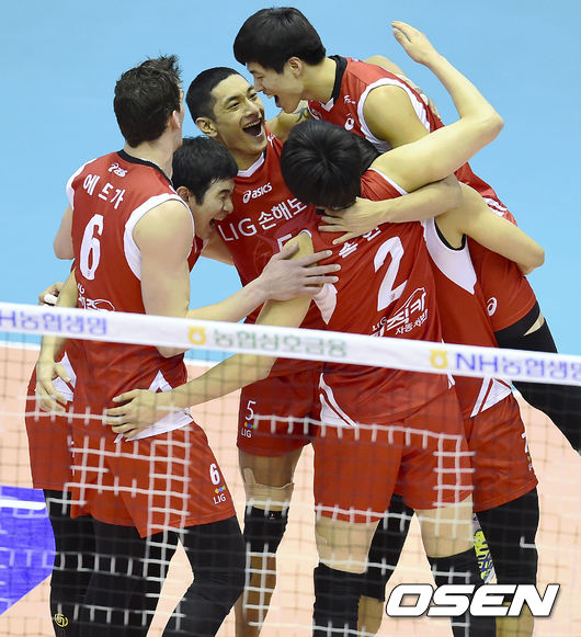 16일 오후 아산 이순신체육관에서 열린 '2014-2015 NH농협 V-리그' 우리카드와 LIG손해보험의 경기, 2세트 LIG 선수들이 득점에 성공하고 기뻐하고 있다.