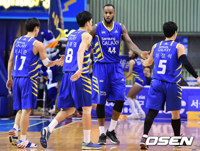 16일 오후 서울 잠실실내체육관에서 열린 '2014-2015 KCC 프로농구' 서울 삼성과 인천 전자랜드의 경기 4쿼터 삼성 선수들이 하이파이브를 하고 있다.