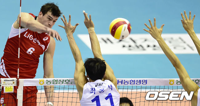 16일 오후 아산 이순신체육관에서 열린 '2014-2015 NH농협 V-리그' 우리카드와 LIG손해보험의 경기, 2세트 LIG 에드가가 우리카드 최홍석의 수비를 피해 공격시도하고 있다.