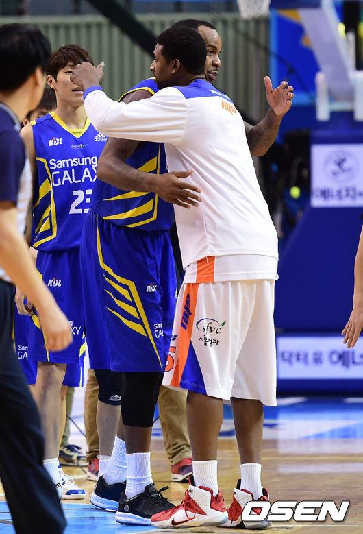 16일 오후 서울 잠실실내체육관에서 열린 '2014-2015 KCC 프로농구' 서울 삼성과 인천 전자랜드의 경기 종료 후 라이온스와 포웰이 포옹을 하고 있다.
