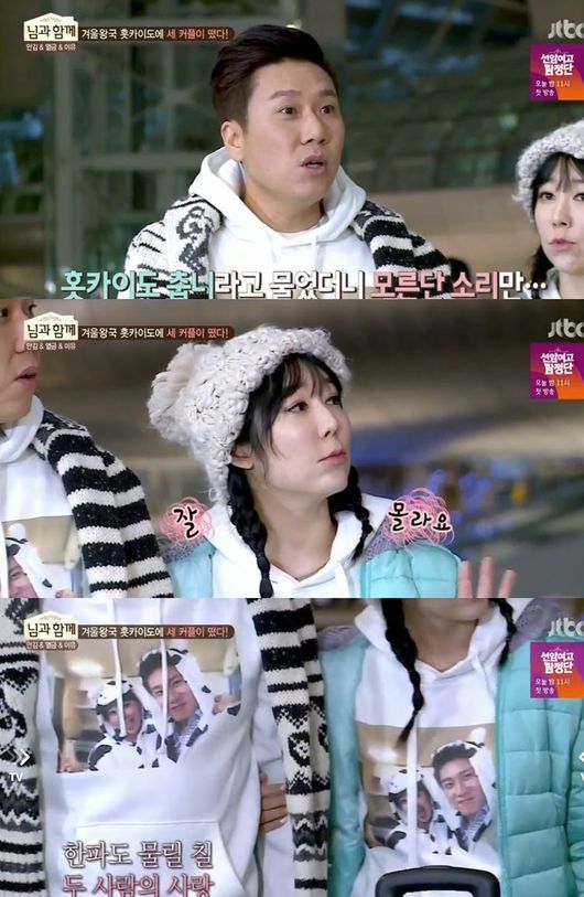 이날 막내부부로 커플티를 입고 나타난 상민-사유리는 상큼한 모습으로 두 선배 커플의 부러움을 샀다. 범수는 "이렇게 입고 안 춥겠냐"고 말했고, 상민은 "의외로 사유리가 일본에 대해 모르더라"며 "훗카이도 춥냐고 물었더니, 잘 모르겠다고 답하더라"고 말했다.