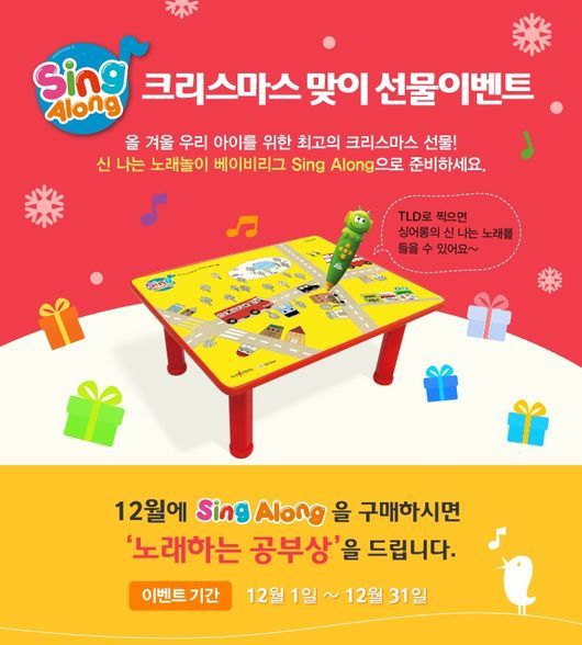 크리스마스를 기념해 싱어롱 12월 구매 소비자 모두에게 싱어롱 노래가 담긴 ‘노래하는 공부상(세이펜 호환 가능)’을 증정한다. ‘노래하는 공부상’은 전자음성인식기능펜 ‘토킹리틀드래곤(Talking Little Dragon, TLD펜)’으로 책상을 찍으면 싱어롱 프로그램의 음악을 들을 수 있어 즐거운 영어 학습을 돕는다.