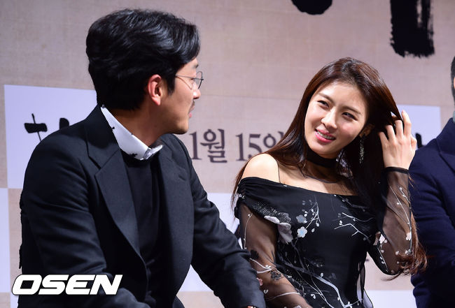 17일 오전 서울 압구정CGV에서 진행된 영화 허삼관(하정우 감독) 제작보고회에서 하지원이 하정우를 바라보고 있다.