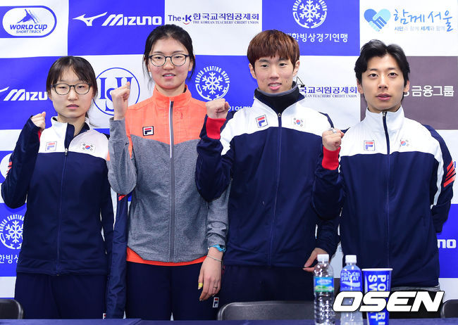 17일 오전 서울 목동 아이스링크에서 열린 '2014-15 ISU 서울 쇼트트랙 월드컵 4차 대회' 한국 대표팀 미디어데이에서 대표팀 최민정, 심석희, 신다운, 곽윤기가 포즈를 취하고 있다.