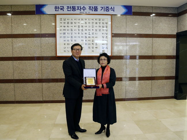 이번 기증작품은 한국전통자수 작품들의 대중화와 전통문화를 되살리는 사업의 일환으로 박인자 작가가 제작한 작품이다. 천연광목을 자연 염색한 바탕 천과 명주실을 이용, 116자에 대한 자수본을 한국전통자수기법인 평수 놓기 기법으로 제작됐다.