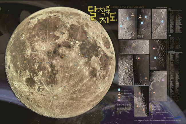 달 착륙지도 상세지도에는 옛 소련 루나 9호부터 24호까지의 우주선 가운데 실제로 착륙에 성공한 루나 우주선 8기, 미국의 서베이어와 아폴로 우주선 11기, 중국 옥토끼 등 20개 우주선의 착륙지점을 따로 표시했다.