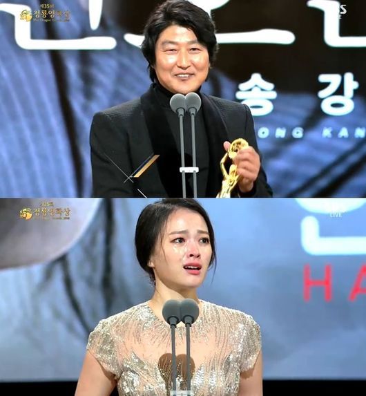 송강호와 천우희가 17일 오후 서울 세종문화회관 대극장에서 열린 제35회 청룡영화제 시상식에서 남녀주연상을 수상했다.