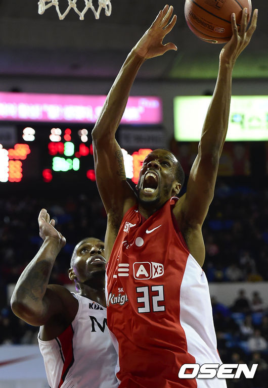 17일 오후 서울 잠실학생체육관에서 열린 '2014-2015 KCC 프로농구' 서울 SK와 울산 모비스의 경기, 4세트 SK 헤인즈가 모비스 라틀리프의 수비를 피해 슛을 성공시키고 있다.