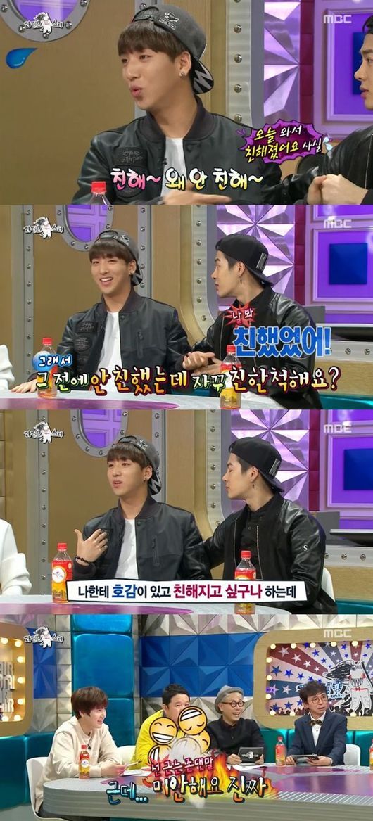 17일 오후 11시 10분 방송된 MBC '황금어장 라디오스타'에는 바로가 "잭슨이 친한척을 한다. 사실 오늘 촬영와서 친해졌다"고 말했다.