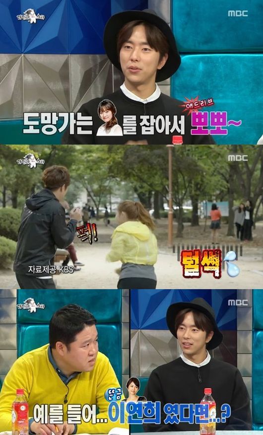 17일 오후 11시 10분 방송된 MBC '황금어장 라디오스타'에는 윤현민이 드라마 촬영 중 김슬기에게 기습 뽀뽀을 한 것을 설명하는 모습이 담겼다.