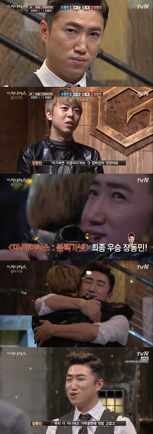 장동민은 17일 오후 방송된 tvN 예능프로그램 '더 지니어스: 블랙 가넷'(이하 '더지니어스3') 최종회에서 펼쳐진 결승전에서 오현민을 누르고 우승을 거머쥐었다. 결승전 게임은 2, 6회전 데스매치였던 베팅 가위바위보와 7회전 데스매치였던 십이장기, 새로운 게임인 같은 숫자 찾기.