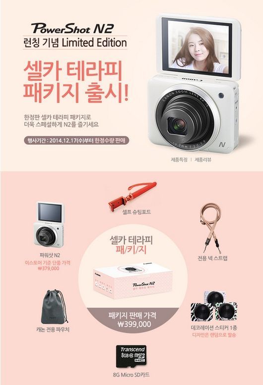 캐논은 구매자를 대상으로 셀카 한 손으로 셀프샷을 손 쉽게 찍을 수 있는 셀프 슈팅포드(셀카봉)부터 파워샷 N2 전용 넥스트랩, 파워샷 N2에 개성을 더해주는 데코레이션 스티커, 케이스, 8G 메모리카드까지 총 5종의 패키지 아이템을 모두 증정한다.