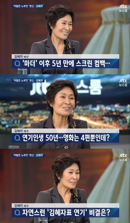 김혜자는 18일 오후 방송된 JTBC '뉴스룸' 2부에 출연해 손석희 앵커와 대담을 나눴다.