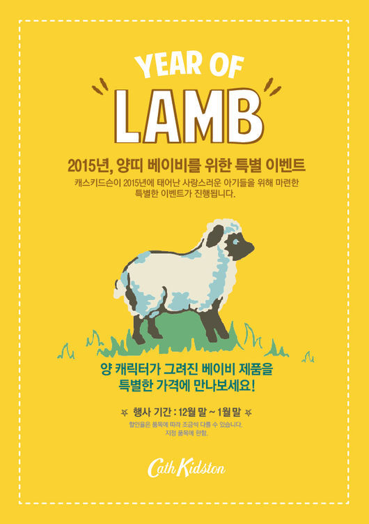 강석민 캐스키드슨 홍보팀 대리는 “순수함을 상징하는 양의 해를 맞아 양의 기운을 받고 태어난 아기들을 위해 이번 프로모션을 마련했다. 양의 해에 새로 태어나는 아기들에게 꼭 필요한 제품들을 합리적인 가격에 구매할 수 있는 좋은 기회인만큼 연말 선물뿐 아니라 출산 선물로 안성맞춤일 것이다”라고 전했다.