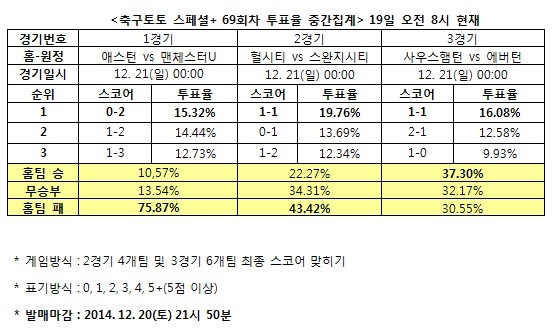 [축구토토] 국민체육진흥공단(www.kspo.or.kr)이 발행하는 체육진흥투표권 공식 인터넷 발매 사이트인 베트맨(www.betman.co.kr)은 오는 21일 자정에 펼쳐지는 애스턴-맨체스터 유나이티드(1경기), 헐시티-스완지시티(2경기), 사우스햄턴-에버턴(3경기)전 등 2014-15 잉글랜드 프리미어리그 3경기를 대상으로 한 축구토토 스페셜+ 69회차 투표율 중간집계 결과, 축구팬의 75.87%는 애스턴-맨체스터U(1경기)전에서 맨유의 승리를 예상했다고 밝혔다.