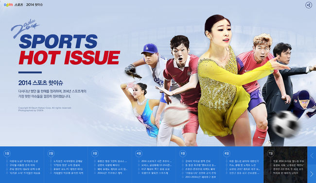 다음 스포츠가 올 한해 화제를 일으켰던 스포츠 주요 이슈를 결산하는 '2014 스포츠 핫이슈' 특집 페이지를 오픈했다. 피겨퀸 김연아, 빙상 여제 이상화의 환상적인 플레이가 돋보였던 소치 동계 올림픽부터 영원한 캡틴 박지성의 은퇴까지, 2014년 한해를 장식한 이슈가 총망라된 특집 페이지에서는 앞서 공개한 상반기 결산에 이어 19일 오늘 6, 7월 이슈 공개를 시작으로 하반기 결산이 시작됐다.