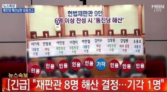 9명 가운데 6명 이상 인용 결정을 내릴 경우 통진당은 해산결정을 받게 되는데 8명의 헌법재판관이 압도적인 인용결정을 내린 것.