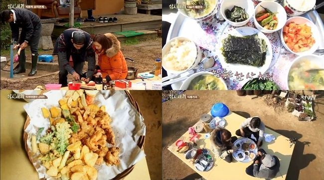 시골에서 만들어 먹는 ‘삼시세끼’ 속 음식 메뉴 또한 화제를 모았다. 달래 된장국, 장칼국수 등 토속적인 메뉴들부터 호떡, 인절미, 염소의 젖을 짜서 만든 리코타 치즈 샐러드, 맷돌로 갈아 만든 커피까지 친근하면서도 새로운 각종 메뉴들이 등장해 시선을 사로잡았다. 이서진과 옥택연은 방송 초반에는 서투른 요리 솜씨로 겨우 끼니를 때우곤 했지만, 날이 갈수록 늘어가는 실력으로 후반에는 겨울을 대비한 김장까지 하는 등 일취월장하는 요리 실력을 보여줬다. 또한 ‘삼시세끼’는 단순히 끼니만 때우는 것이 아니라, 어설프지만 정성이 담긴 음식을 소중한 사람들과 함께 나누어 먹으며 함께 하는 시간을 통해 따뜻함을 선사했다. 게스트였던 김광규, 이승기 등은 직접 수수밭의 수수를 베고, 최지우는 함께 김장을 담그고 가는 등 서로의 온정을 나누는 모습도 훈훈함을 안겼다.