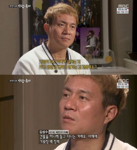 김성수는 20일 오전 8시 55분 방송된 MBC '휴먼다큐 사람이 좋다'에서 가장이 된다는 것에 대해 "힘들다. 어깨에 건물이 있다. 기왓장 백장씩 올라가 있는 것 같다"고 말했다.