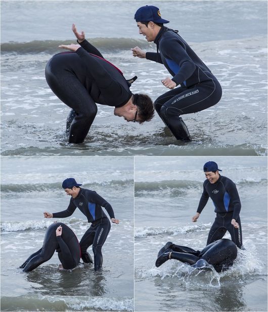 무엇보다 바닷물로 곤두박질친 데프콘은 자연스럽게 입수를 해 웃음을 자아내고 있다. 갈 곳을 잃어버린 육중한 데프콘의 앞구르기 입수에 함께 있던 김주혁은 웃음을 참지 못하고 즐거워하고 있는 상황.