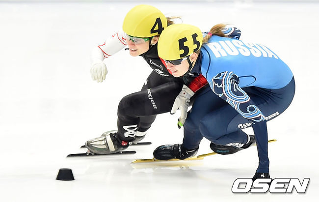 여자 1000m 패자부활전 준결승에서 캐나다 카산드라와 러시아 이브제니야가 치열한 레이스를 펼치고 있다.