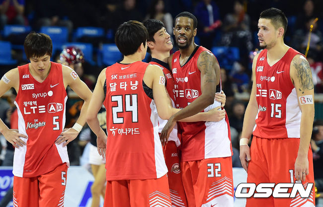 20일 오후 서울 잠실학생체육관에서 열린 '2014-2015 KCC 프로농구' 서울 SK와 인천 전자랜드의 경기 종료 후 SK 선수들이 서로를 격려하고 있다.