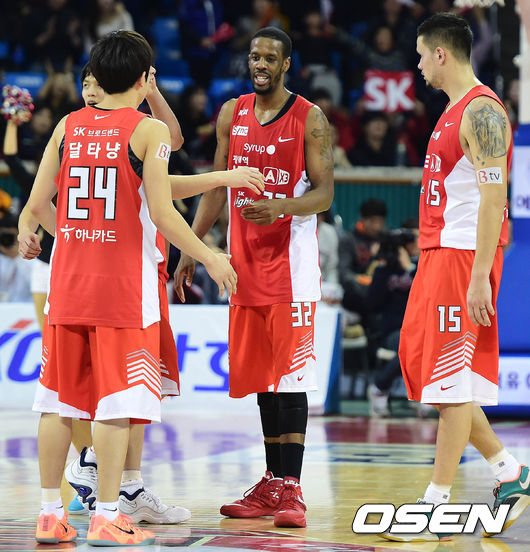 20일 오후 서울 잠실학생체육관에서 열린 '2014-2015 KCC 프로농구' 서울 SK와 인천 전자랜드의 경기 종료 후 SK 선수들이 서로를 격려하고 있다.