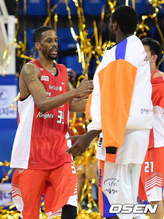 20일 오후 서울 잠실학생체육관에서 열린 '2014-2015 KCC 프로농구' 서울 SK와 인천 전자랜드의 경기 종료 후 헤인즈와 레더가 인사를 나누고 있다.