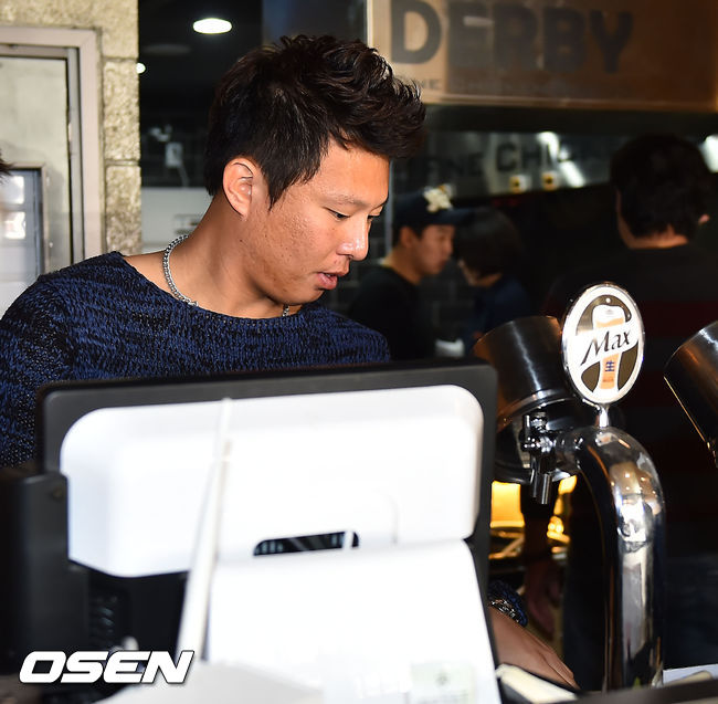 20일 서울 강남구 자곡로 치킨더비 자곡점에서 열린 故 이두환 추모 자선 일일호프 행사에서 두산 김강이 카운터를 살피고 있다.