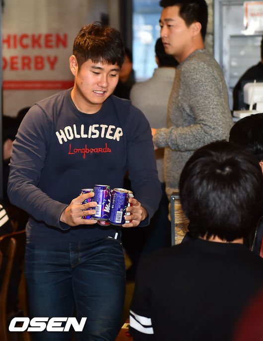20일 서울 강남구 자곡로 치킨더비 자곡점에서 열린 故 이두환 추모 자선 일일호프 행사에서 LG 김재율이 음료를 운반하고 있다.