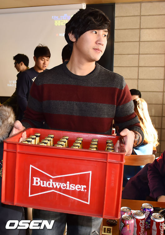 20일 서울 강남구 자곡로 치킨더비 자곡점에서 열린 故 이두환 추모 자선 일일호프 행사에서 두산 이용찬이 맥주박스를 나르고 있다.