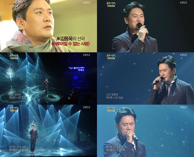 JK김동욱은 20일 오후 방송된 KBS 2TV '불후의 명곡-전설을 노래하다(이하 '불후')'에서 양희은 특집을 맞아 '이루어질 수 없는 사랑'을 선곡, 감성적인 무대를 선보였다.