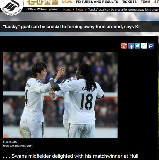 지난 3일 퀸즈파크레인저스(QPR)와의 14라운드에서 2호골을 터뜨렸던 기성용은 3경기 만에 골맛을 보며 소속팀 스완지시티의 2연패 탈출을 위한 선봉장에 섰다. 이날 기성용의 골에는 운이 따랐다. 존조 셸비의 중거리 슛이 기성용의 몸에 맞고 굴절되면서 그대로 골로 연결됐다.