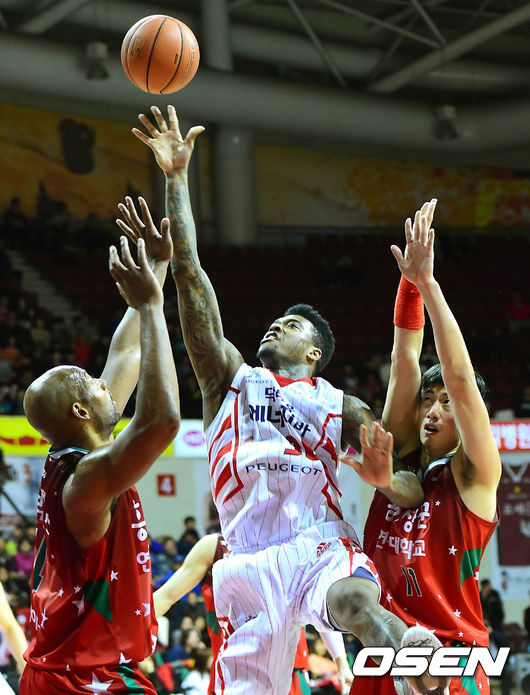 3쿼터, 오리온스 가르시아가 KGC 윌리암스와 양희종의 수비를 피해 슛을 시도하고 있다.