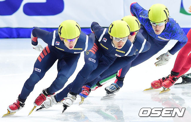 21일 오후 서울 목동 아이스링크에서 열린 '2014-2015 국제빙상연맹(ISU) 쇼트트랙 월드컵 4차 대회' 남자 3000m 준결승전에서 이정수(왼쪽부터), 곽윤기, 신다운이 경기를 펼치고 있다.