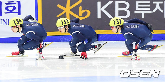 21일 오후 서울 목동 아이스링크에서 열린 '2014-2015 국제빙상연맹(ISU) 쇼트트랙 월드컵 4차 대회' 남자 3000m 준결승전에서 이정수(왼쪽부터), 곽윤기, 신다운이 경기를 펼치고 있다.