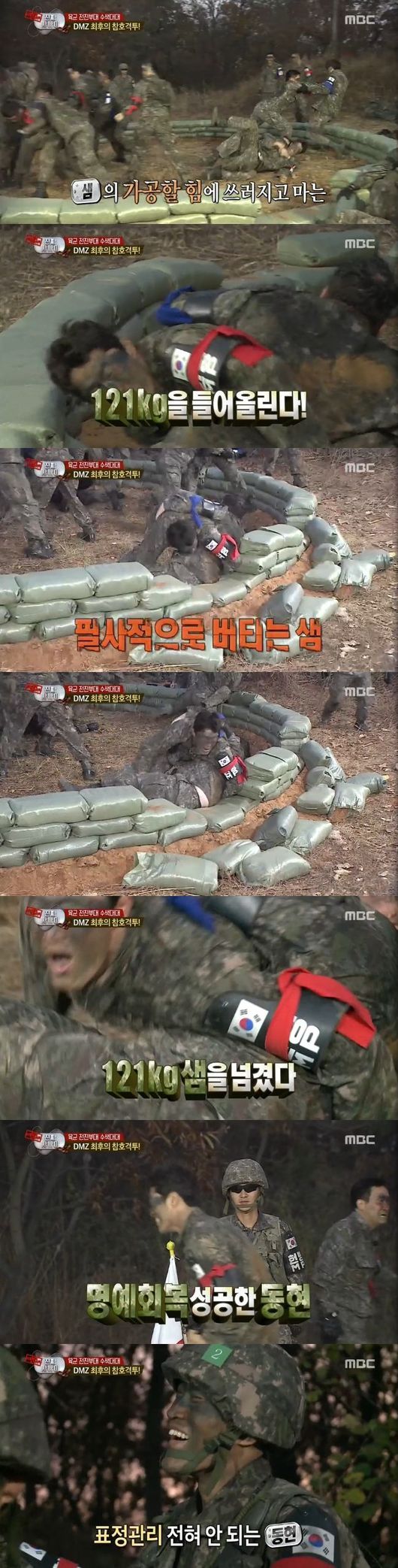 김동현은 21일 오후 방송된 MBC 예능프로그램 '일밤-진짜사나이'(이하 '진짜사나이')에서 두 편으로 나뉘어 참호격투를 하던 중 샘 해밍턴과 경쟁을 벌이게 됐다.