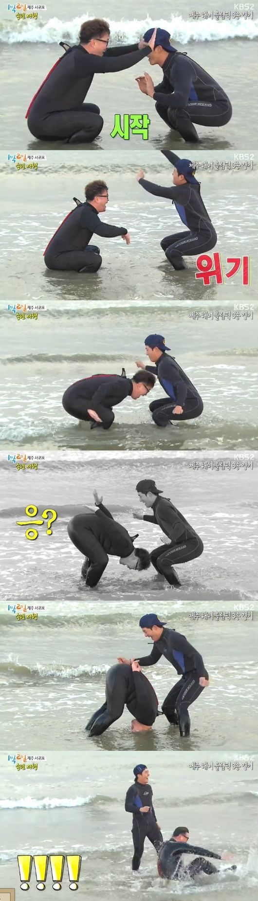이날 멤버들은 모슬포항에서 풍랑경보가 내려져 마라도에 들어갈 수 없게 되자 환호했다. 하지만 제작진이 꺼내든 플랜B는 더 가혹했다. 멤버들은 점심 복불복으로 해녀 수트를 입고 바람을 이기는 게임을 해야 했던 것.