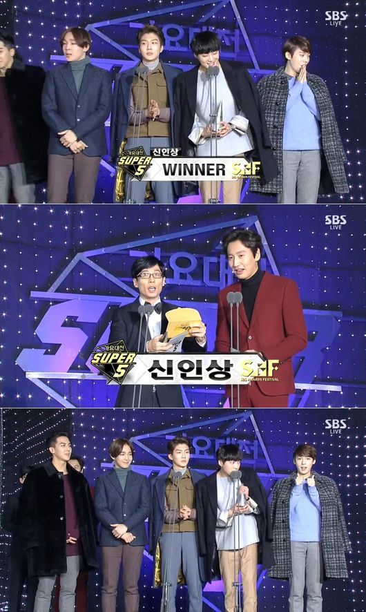 위너는 21일 오후 8시 45분부터 생방송된 SBS ‘가요대전-슈퍼5’에서 올해의 신인상을 수상했다.