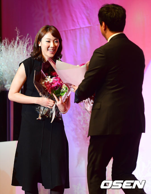 우수상을 수상한 농구선수 박혜진이 축하 꽃다발을 받고 있다.