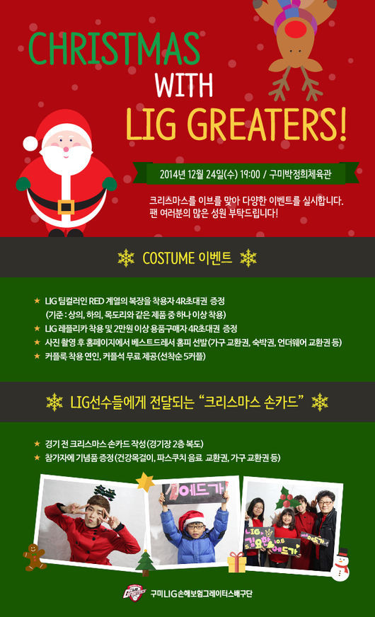 LIG손해보험 배구단(단장 박주천)이 크리스마스 이브인 24일 OK저축은행과 홈경기서 'Christmas with LIG Greaters' 이벤트를 실시한다.