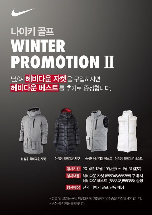 이번 이벤트는 헤비다운 재킷 구매 시 30만 원 상당의 헤비다운 베스트를 증정하는 형식으로 백화점을 포함한 전국 나이키 골프 단독 매장에서 진행한다.