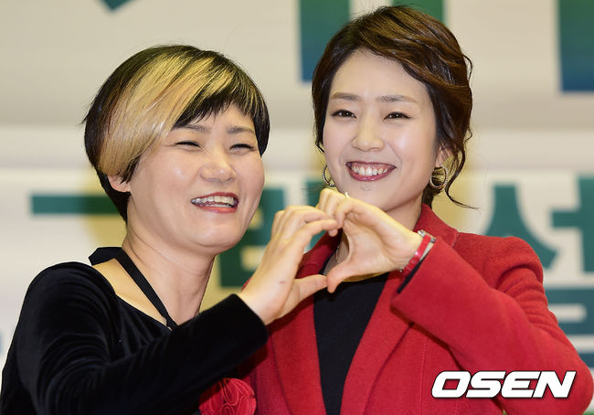 국은주 PD와 고민정 아나운서가 포토타임을 갖고 있다.