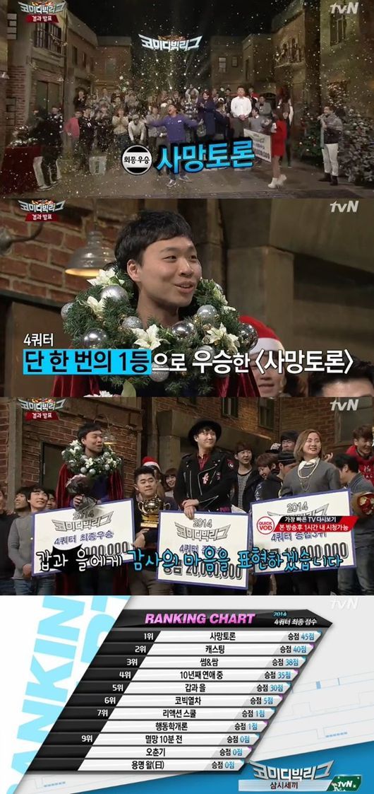 이날 방송에서는 최장수 코너 '사망토론'이 2014년 4쿼터 최종 우승자로 뽑혔으며, 우승상금 3천만원을 얻게 됐다. 2위 ‘캐스팅’에 2천만원, 3위 ‘썸&쌈’에게 천만원의 상금이 각각 수여됐다.